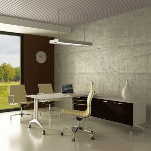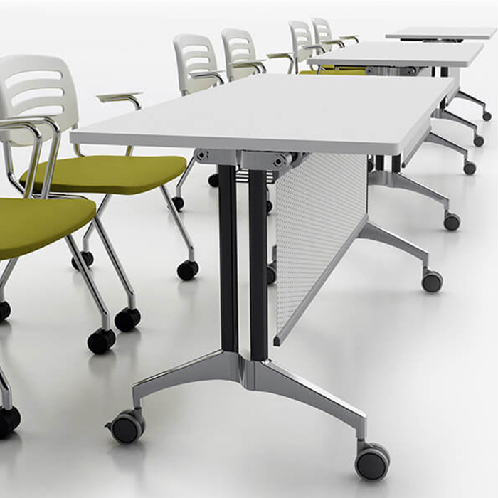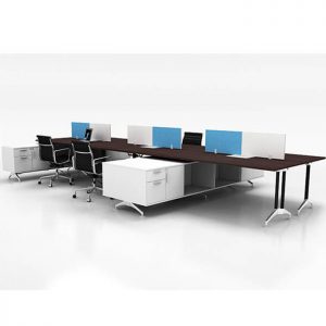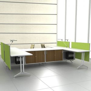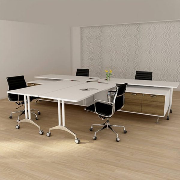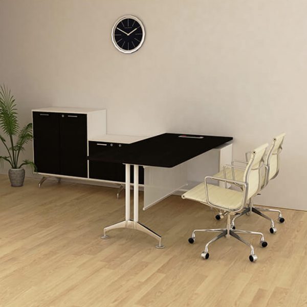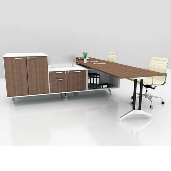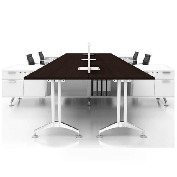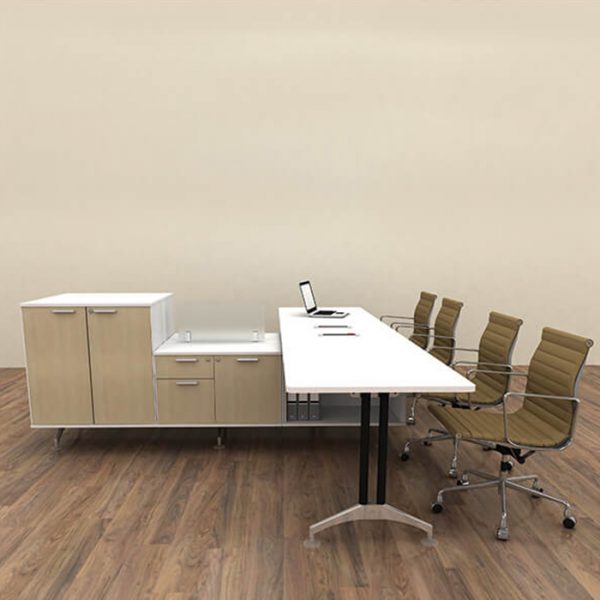 IF, structured with aluminum extrusion on a rigid aluminium die-cast base, allowing the system to be configured to please workplace aesthetic and suit all corporate functions. Complete with intelligently design wire management system, cables are hidden underneath table top and cabinets.